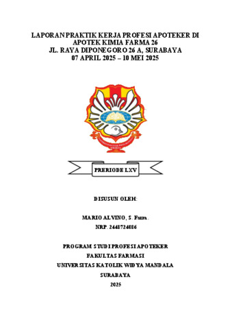 Alvino, Mario (2025) Laporan praktik kerja profesi apoteker di Apotek Kimia Farma 26 Jl. Raya Diponegoro 26 A, Surabaya 07 April 2025 - 10 Mei 2025. Project Report (PKL, PKIPP, Magang D3, Praktik Kerja Profesi Apoteker, Profesi Guru, Profesi Ners dan Profesi Insiyur). Faculty of Pharmacy, Surabaya. (Submitted)