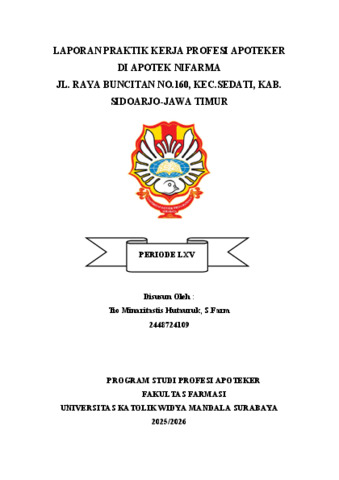 Hutauruk, Tio Minaritatis (2025) Laporan praktik kerja profesi apoteker di Apotek Nifarma Jl.Raya Buncitan No.160, Kec.Sedati, Kab.Sidoarjo-Jawa Timur 07 April-10 Mei 2025. Project Report (PKL, PKIPP, Magang D3, Praktik Kerja Profesi Apoteker, Profesi Guru, Profesi Ners dan Profesi Insiyur). Faculty of Pharmacy, Surabaya. (Submitted)