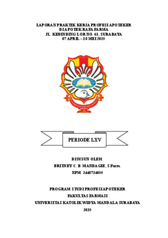 Mandagie, Britney Chelsea Brigitta (2025) Laporan praktik kerja profesi apoteker di Apotek Rafa Farma Jl. Kedinding Lor No. 63, Surabaya 07 April-10 Mei 2025. Project Report (PKL, PKIPP, Magang D3, Praktik Kerja Profesi Apoteker, Profesi Guru, Profesi Ners dan Profesi Insiyur). Faculty of Pharmacy, Surabaya. (Submitted)