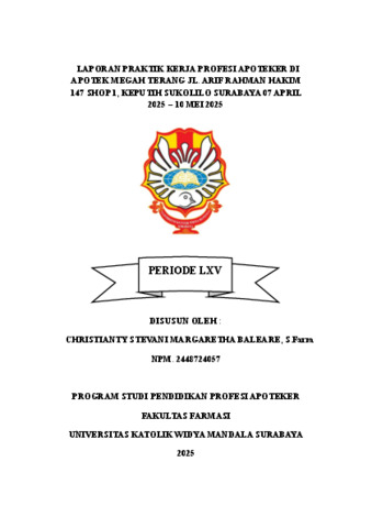 Baleare, Christianty Stevani Margaretha (2025) Laporan praktik kerja profesi apoteker di apotek Megah Terang Jl. Arif Rahman Hakim 147 Shop 1, Keputih Sukolilo Surabaya 07 April-10 Mei 2025. Project Report (PKL, PKIPP, Magang D3, Praktik Kerja Profesi Apoteker, Profesi Guru, Profesi Ners dan Profesi Insiyur). Faculty of Pharmacy, Surabaya, Indonesia. (Submitted)