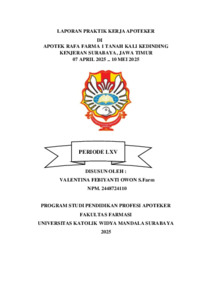 Owon, Valentina Febiyanti (2025) Laporan Praktik Kerja Apoteker di apotek Rafa Farma 1 Tanah Kali Kedinding Kenjeran Surabaya, Jawa Timur 07 April 2025 – 10 Mei 2025. Project Report (PKL, PKIPP, Magang D3, Praktik Kerja Profesi Apoteker, Profesi Guru, Profesi Ners dan Profesi Insiyur). Widya Mandala Surabaya Catholic University, Surabaya, Indonesia. (Submitted)