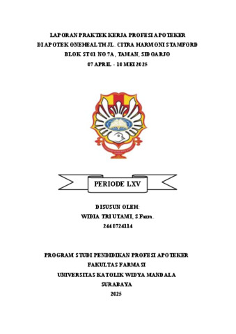 Utami, Widia Tri (2025) Laporan Praktek Kerja Profesi Apoteker di Apotek Onehealth jl. Citra harmoni stamford blok st 01 no.7a, Taman, Sidoarjo 07 April - 10 Mei 2025. Project Report (PKL, PKIPP, Magang D3, Praktik Kerja Profesi Apoteker, Profesi Guru, Profesi Ners dan Profesi Insiyur). Faculty of Pharmacy: Pharmacist Professionals, Surabaya. (Submitted)