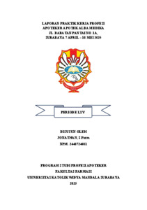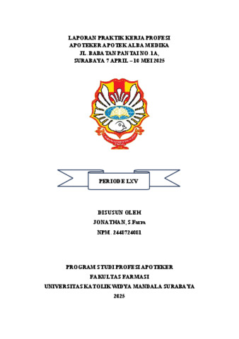 Jonathan, Jonathan (2025) Laporan praktik kerja profesi apoteker apotek Alba Medika lL. Babatan pantai No. 1A, Surabaya 7 April – 10 Mei 2025. Project Report (PKL, PKIPP, Magang D3, Praktik Kerja Profesi Apoteker, Profesi Guru, Profesi Ners dan Profesi Insiyur). Faculty of Pharmacy, Surabaya. (Submitted)