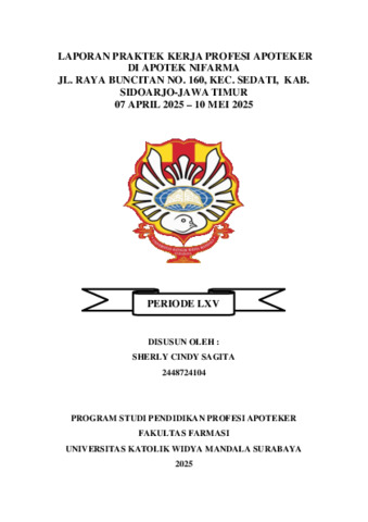 Sagita, Sherly Cindy (2025) Laporan praktik kerja profesi apoteker di Apotek Nifarma Jl. Raya Buncitan No. 160, Kec.Sedati, Kab.Sidoarjo-Jawa Timur 07 April 2025-10 Mei 2025. Project Report (PKL, PKIPP, Magang D3, Praktik Kerja Profesi Apoteker, Profesi Guru, Profesi Ners dan Profesi Insiyur). Faculty of Pharmacy, Surabaya. (Submitted)