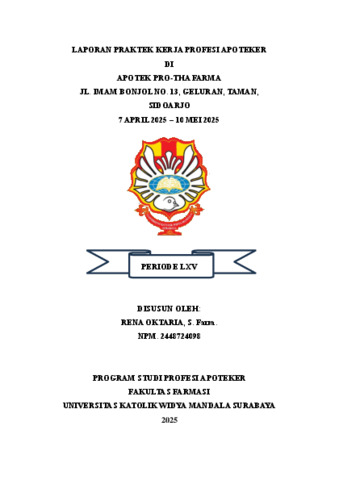 Oktaria, Rena (2025) Laporan praktek kerja profesi apoteker di apotek Pro-THA Farma Jl.Imam Bonjol No.13 Geluran-Sidoarjo 7 April 2025 - 10 Mei 2025. Project Report (PKL, PKIPP, Magang D3, Praktik Kerja Profesi Apoteker, Profesi Guru, Profesi Ners dan Profesi Insiyur). Faculty of Pharmacy, Surabaya, Indonesi. (Submitted)