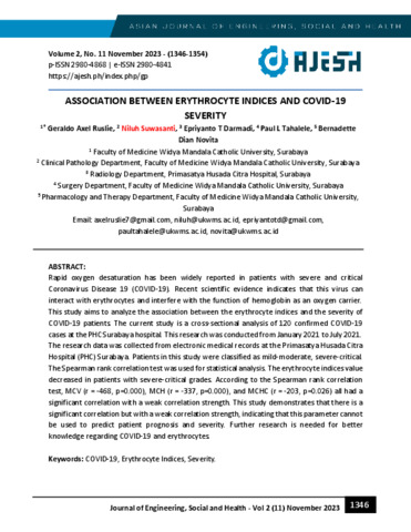 Ruslie, Geraldo Axel, Suwasanti, Niluh, Darmadi, Epriyanto T., Tahalele, Paul L and Novita, Bernadette Dian (2023) Association Between Erythrocyte Indices and COVID-19 Severity. Asian Journal of Engineering, Social and Health, 2 (11). pp. 1346-1354. ISSN p-ISSN: 29804868, e-ISSN: 29804841