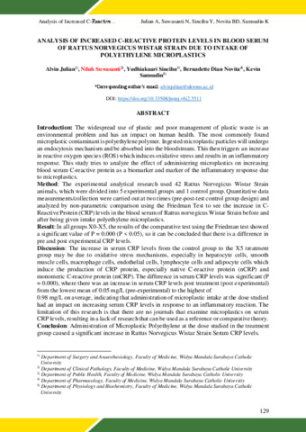Julian, Alvin, Suwasanti, Niluh, Sincihu, Yudhiakuari, Novita, Bernadette Dian and Samsudin, Kevin (2024) Analysis of Increased C-Reactive Protein Levels in Blood Serum of Rattus norvegicus wistar strain due tointake of polyethylene microplastics. Journal of Widya Medika Junior, 6 (2). pp. 129-146. ISSN 26561409