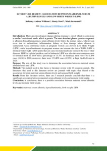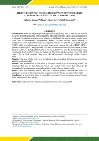 Williana, Stefani, Dewi, Sianty and Suwasanti, Niluh (2023) Literature review: association between maternal serum albumin levels and low birth weight (LBW) literature review: association between maternal serum albumin levels and low birth weight (LBW). Journal of Widya Medika Junior, 5 (2). pp. 92-97. ISSN 26561409