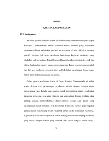 Aktivitas graphic design dalam divisi marketing Communication di sebuah perusahaan memiliki peranan penting, terutama dalam perusahaan food and beverages seperti Expat Roasters Dharmahusada. Graphic design berfungsi sebagai salah satu alat komunikasi atau media untuk menarik perhatian konsumen, membangun brand image, dan mempengaruhi keputusan pembelian yang sejalan dengan tujuan dan peran marketing communication dalam sebuah perusahaan. Dalam Expat Roasters Dharmahusada, graphic design bertanggung jawab dalam membuat konsep, foto produk, dan membuat desain untuk promosi menu-menu baru. Graphic design dalam Expat Roasters Dharmahusada diminta untuk dapat membuat media promosi cetak yang sesuai dengan tema yang hendak diangkat dan sesuai dengan produk-produk yang dihasilkan, serta sesuai dengan brand image. Oleh karena itu, graphic design memiliki tugas penting dalam menjaga kualitas desain yang dihasilkan agar sesuai dengan tujuan dan brand image yang dibangun.