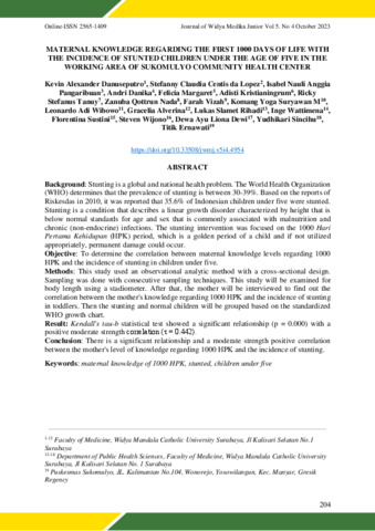 Danuseputro, Kevin Alexander, Lopez, Stefanny Claudia Centis da, Pangaribuan, Isabel Nauli Anggia, Danika, Andri, Margaret, Felicia, Kristianingrum, Adisti, Tanuy, Ricky Stefanus, Nada, Zanuba Qottrun, Vizah, Farah, Mahardika, Komang Yoga Suryawan, Wibowo, Leonardo Adi, Alverina, Gracelia, Rihadi, Lukas Slamet, Wattimena, Inge, Sustini, Florentina, Wijono, Steven, Dewi, Dewa Ayu Liona, Sincihu, Yudhiakuari and Ernawati, Titiek (2023) Maternal knowledge regarding the first 1000 days of life with the incidence of stunted children under the age of five in the working area of sukomulyo community health center. JOURNAL OF WIDYA MEDIKA JUNIOR, 5 (4). pp. 204-212. ISSN 26561409