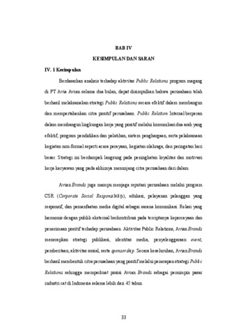 Aktivitas public relation merupakan segala bentuk komunikasi yang terencana, ke dalam maupun ke luar antara suatu perusahaan dengan semua khalayaknya untuk mencapai tujuan-tujuan yang spesifik berlandaskan pada perusahaan. Tugas utama public relation adalah membagun citra perusahaan serta mempertahankan citra yang sudah terbentuk. Menurut Scott M. Cutlip, Aleen H. Center dan Glen M. Broom, public relation bertujuan untuk membujuk masyarakat, investor, mitra, karyawan, dan untuk mempertahankan sudut pandang terhadap perusahaan. PT Avia Avian Tbk atau lebih dikenal dengan Avian Brands merupakan perusahaan cat dan pelapis bangunan terkemuka di Indonesia yang didirikan sejak tahun 1978 di Sidoarjo. Perusahaan ini menjalankan strategi public relation melalui berbagai bentuk kegiatan antara lain publikasi, penguatan identitas media, penyelenggaraan event, pembuatan berita, keterlibatan dalam aktivitas sosial, hingga pemberian sponsorship. Seluruh aktivitas tersebut bertujuan membangun awareness, memperkuat komunikasi internal maupun eksternal perusahaan, serta menciptakan citra positif dimata karyawan, konsumen, investor, maupun masyarakat luas. Avian Brands menerapkan strategi public relation internal dan eksternal dengan baik sehingga berhasil membangun citra positif dan menjaga eksistensinya sebagai perusahaan cat terkemuka di Indonesia dengan menampilkan strategi public relation yang positif dan berkelanjuatan.