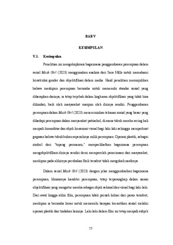 Penelitian ini menganalisis objektifikasi perempuan dalam serial Mask Girl (2023) melalui pendekatan analisis wacana kritis Sara Mills, menggunakan teori objektifikasi Martha Nussbaum, dan male gaze dari Laura Mulvey. Teori objektifikasi Nussbaum membahas bagaimana perempuan diperlakukan sebagai alat pemuas kebutuhan laki-laki, sementara male gaze Mulvey menjelaskan posisi perempuan sebagai objek visual dalam media. Fenomena yang diamati menunjukkan bahwa wajah perempuan yang kurang cantik akan dipandang rendah dan memicu pelecehan, sementara transformasi fisiknya melalui operasi plastik tetap membuatnya terjebak dalam peran sebagai objek seksual. Fokus utama penelitian akan mengeksplorasi mengenai tekanan sosial dan kekerasan simbolik, termasuk penggambaran tubuh sebagai komoditas dan pemuas mata laki-laki, stigma sosial dan pelecehan seksual, serta operasi plastik sebagai "topeng permanen”. Hasil penelitian menegaskan bahwa meskipun perempuan berupaya menyesuaikan diri dengan standar sosial, mereka tetap diposisikan sebagai objek terutama berdasarkan tubuh perempuan. Serial ini menjadi cerminan bagaimana perempuan tidak sepenuhnya memiliki kendali atas tubuh mereka, terlepas dari upaya memenuhi ekspektasi masyarakat.