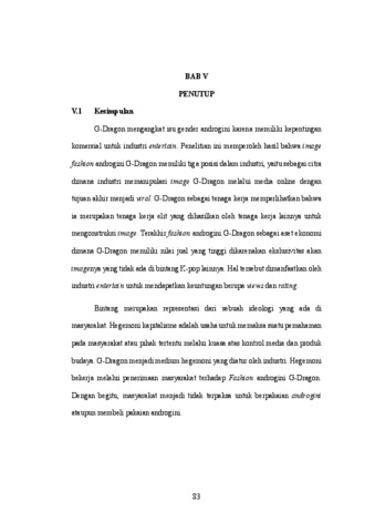 G-Dragon seorang bintang K-pop yang dikenal dengan fashion androgininya. Menjadi menarik ketika bintang dari Korea Selatan mengangkat isu gender dalam imagenya melihat Korea Selatan merupakan negara konservatif dimana isu gender masih dianggap sensitif. Penelitian ini berfokuskan pada bagaimana G-dragon mengonstruksi image fashion androgininya di publik. Dalam kajian star studies milik Richard Dyer, seorang bintang dipercaya mengonstruksi imagenya untuk kepentingan komersial. Metode penelitian yang digunakan adalah Semiotika milik Charles Sanders Peirce. G-Dragon memiliki tiga posisi dalam industri, yaitu sebagai citra dimana industri memanipulasi image G-Dragon melalui media online dengan tujuan akhir menjadi viral. G-Dragon sebagai tenaga kerja memperlihatkan bahwa ia merupakan tenaga kerja elit yang dihasilkan oleh tenaga kerja lainnya untuk mengonstruksi image. Terakhir fashion androgini G-Dragon sebagai aset ekonomi dimana G-Dragon memiliki nilai jual yang tinggi dikarenakan ekslusivitas akan imagenya yang tidak ada di bintang K-pop lainnya. Hal tersebut dimanfaatkan oleh industri entertain untuk mendapatkan keuntungan berupa views dan rating