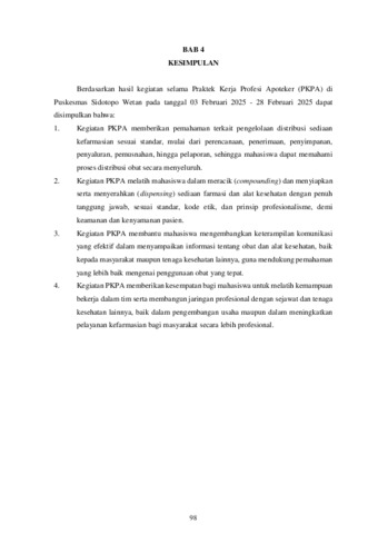 Gunawan, Maggie Anastasya, Amalia, Wa Ode Nur Nisa and Larasati, Yohana (2025) Laporan praktek kerja profesi apoteker di Puskesmas Sidotopo Wetan Jl. Randu No. 38, Kenjeran, Surabaya 2 Juni – 28 Juni 2025. Project Report (PKL, PKIPP, Magang D3, Praktik Kerja Profesi Apoteker, Profesi Guru, Profesi Ners dan Profesi Insiyur). Faculty of Pharmacy, Surabaya. (Submitted)