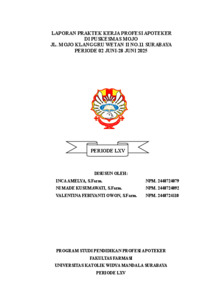 Amelya, Inca, Kusumawati, Ni Made and Owon, Valentina Febiyanti (2025) Laporan praktek kerja profesi apoteker di Puskesmas Mojo Jl. Mojo Klanggru Wetan II No.11 Surabaya Periode 02 Juni-28 Juni 2025. Project Report (PKL, PKIPP, Magang D3, Praktik Kerja Profesi Apoteker, Profesi Guru, Profesi Ners dan Profesi Insiyur). Faculty of Pharmacy, Surabaya. (Submitted)