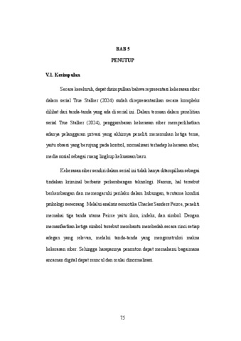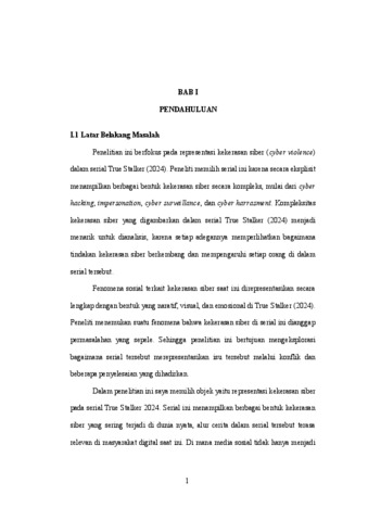 Serial True Stalker (2024) merepresentasikan kekerasan siber yang secara eksplisit menampilkan berbagai bentuk kekerasan siber secara kompleks dan relevan dengan fenomena digital masa kini. Penelitian ini menggunakan pendekatan kualitatif dengan metode deskriptif untuk menganalisis bagaimana kekerasan siber yang digambarkan dalam serial tersebut mencerminkan dengan kasus kekerasan siber saat ini. Analisis dilakukan menggunakan teori Semiotika Charles Sanders Peirce, yang terdiri dari tiga komponen utama yaitu: ikon, indeks, dan simbol, dan untuk menemukan bagaimana tanda-tanda tersebut membentuk representasi kekerasan siber sebagai isu sosial yang ada. Kekerasan siber sangat berhubungan dengan privasi sehingga aksi teror ini tidak tergolong ringan. Representasi ini memperlihatkan bagaimana kekerasan siber terjadi karena beberapa faktor utama, yaitu obsesi yang berujung mengontrol korban, bentuk normalisasi kekerasan siber, dan kekuasaan dari media sosial. Selain itu, serial ini juga menunjukkan bagaimana lingkungan sosial turut berperan aktif dalam menormalkan tindakan kekerasan siber melalui sikap toleran, serta anggapan bahwa pelanggaran privasi di dunia maya bukanlah ancaman serius. Hasil analisis menunjukkan bahwa serial True Stalker (2024) tidak hanya menampilkan bentuk kekerasan siber sebagai suatu fenomena kriminal semata, namun sebagai bentuk refleksi dari budaya digital yang semakin kompleks, di mana batasan antara privasi dengan keterbukaan informasi menjadi semakin kabur.
