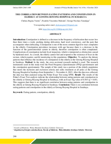 Yunita, Chelsea Regina, Malonda, Franklin V. and Tanudjaja, George Nicolaus (2024) The Correlation Between Eating Patterns and Constipation in The Elderly at the Gotong Royong Hospital in Surabaya. Journal of Widya Medika Junior, 6 (4). pp. 290-298. ISSN 26561409