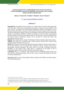Introduction: Osteoarthritis (OA) of the knee is a chronic disease caused by the degeneration of the knee joint, which causes inflammation that triggers excessive pain and interferes with daily activities. According to the World Health Organization (WHO), osteoarthritis is one of the main factors that lead to a decrease in the function of a person's quality of life in the world. The choice of therapy for patients with severe osteoarthritis can be given total knee replacement surgery to treat patient complaints, especially in the aspect of excessive pain. Assessing and knowing disorders of the knee joint and the quality of life of patients with osteoarthritis before and after total knee replacement surgery can be assessed by scoring knee injury and osteoarthritis outcome scores. Purpose: To compare patients' quality of life before and after total knee replacement surgery. Method: This study uses a literature study method, journals obtained from searches using certain keywords within the last ten years. Result: The literature study found that eight journals had similarities with the research topic on the research objectives and ten journals had similarities with the research topic using a questionnaire research instrument. The study results in ten kinds of literature follow the hypothesis on the research topic, which shows a comparison of the quality of life in osteoarthritis patients before and after total knee replacement surgery. Conclusion: There is a comparison of the quality of life of osteoarthritis patients before and after total knee replacement surgery. There is also a study of clinical and functional outcomes of total knee replacement.