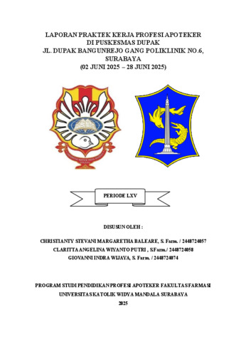 Putri, Claritta Angelina Wiyanto, Baleare, Christianty Stevani Margaretha and Wijaya, Giovanni Indra (2025) Laporan praktek kerja profesi apoteker di Puskesmas Dupak Jl. Dupak Bangunrejo Gang Poliklinik No. 6, Surabaya 02 Juni 2025-28 Juni 2025. Project Report (PKL, PKIPP, Magang D3, Praktik Kerja Profesi Apoteker, Profesi Guru, Profesi Ners dan Profesi Insiyur). Faculty of Pharmacy, Surabaya. (Submitted)