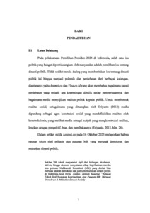 Isu dinasti politik yang kembali mencuat setelah putusan Mahkamah Konstitusi pada Oktober 2023 yang dinilai berimplikasi pada pencalonan Gibran Rakabuming Raka sebagai calon wakil presiden tahun 2024. Perdebatan ini menimbulkan pandangan pro-kontra dari berbagai kalangan pada media online. Penelitian ini bertujuan untuk membingkai narasi pemberitaan perdebatan dinasti politik pada media Asumsi.co dan Viva.co.id menjelang pemilihan presiden 2024. Penelitian ini menggunakan teori framing milik William A. Gamson untuk menelisik perangkat framing dan perangkat penalaran dalam rekonstruksi realitas media. Dengan menggunakan metode framing milik William A. Gamson, peneliti akan membredel setiap berita dari Asumsi.co dan Viva.co.id yang telah dikategorikan dalam 4 (empat) topik berita. Analisis dari 8 (delapan) menunjukkan perbedaan yang konsisten dari kedua media. Asumsi.co membingkai keputusan MK sebagai bentuk penyalahgunaan kewenangan, ancaman demokrasi, dan permasalahan serius bagi masa depan negara, dengan menggunakan metafora seperti “karpet merah” dan “mahkamah keluarga”, serta menonjolkan narasumber mahasiswa dari organisasi BEM Nusantara dan tokoh yang berpengaruh untuk memperkuat bingkai perlawanan dari kalangan anak muda. Sebaliknya, Viva.co.id membingkai tudingan dinasti politik sebagai pengisahan yang dapat terbantahkan dengan menonjolkan prinsip bahwa pemilu sepenuhnya berada di tangan rakyat sebagai pemegang kedaulatan tertinggi dan bukan muncul dari partai yang tergambar dari narasi moral Jokowi dan afirmasi dukungan Prabowo. Asumsi.co secara konsisten menganggap keputusan Mahkamah Konstitusi serta masalah dinasti politik sebagai ancaman serius terhadap demokrasi. Sebaliknya, Viva.co.id menganggap isu dinasti politik bukanlah masalah utama dalam demokrasi, karena telah melalui cara dan prosedur yang resmi.