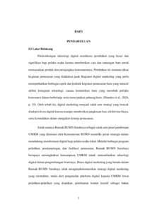 Perkembangan dunia digital membawa aktivitas baru bagi para pelaku UMKM. Kegiatan pemasaran digital menjadi salah satu strategi baru untuk menjangkau pasar yang lebih luas dan peluang yang baru. Kegiatan kerja praktik ini dilakukan pada divisi digital marketing di Rumah BUMN Surabaya. Hasil penelitian menunjukkan bahwa digital marketing berperan dalam meningkatkan kualitas UMKM, melalui aktivitas-aktivitas pelatihan dan pembuatan konten UMKM. Kesimpulannya, digital marketing terbukti menjadi strategi dalam memperkuat daya saing dan kualitas UMKM, namun diperlukan penguatan kapasitas berkelanjutan lewat strategi-strateg digital marketing lainnya agar optimalisasi implementasinya dapat tercapai secara menyeluruh.