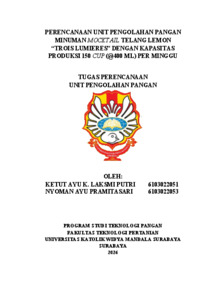Putri, Ketut Ayu Kurniasih Laksmi and Pramitasari, Nyoman Ayu (2025) Perencanaan unit pengolahan pangan minuman mocktail Telang Lemon “Trois Lumieres” dengan kapasitas produksi 150 cup @400 mL per minggu. Technical Report (Perencanaan Unit Pengolahan Pangan (FTP), Makalah Komprehensif (FTP)). Faculty of Agricultural Technology, Surabaya. (Submitted)
