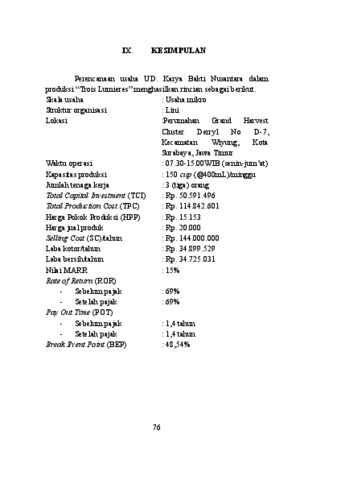 UD. Karya Bakti Nusantara merupakan unit pengolahan pangan yang memproduksi minuman mocktail telang lemon dengan merek dagang “Trois Lumieres”. Kunikan dari produk ini adalah sirup telang dan potongan slice lemon dengan penambahan air bersoda, boba agar, dan es batu. Penyajian produk menggunakan holder cup bambu. Minuman mocktail terdiri dari gradasi warna yaitu biru hingga ungu. Unit pengolahan pangan “Trois Lumieres” dilakukan dalam skala rumah tangga yang tergolong UMKM dengan kapasitas produksi 150 cup (@400 mL) per minggu dengan kemasan cup plastik ukuran tinggi 13 cm dan diameter 5,5 cm. Proses pengolahan minuman mocktail terdiri pembuatan sirup bunga telang, boba agar, dan penyajian minuman. UD. Karya Bakti Nusantara menggunakan struktur organisasi lini yang dijalankan oleh 1 manajer dan 2 karyawan dengan waktu kerja 5 hari/minggu (8 jam/hari). Lokasi Perusahaan terletak di Perumahan Grand Harvest Cluster Derryl No D-7, Kecamatan Wiyung, Kota Surabaya, Jawa Timur. Target pasar produk “Trois Lumieres” adalah remaja awal hingga lansia awal (12-55 tahun). Minuman “Trois Lumieres” memerlukan total modal industri (TCI) sebesar Rp. 125.976.533 dengan sumber modal utama berasal dari pemilik dan total biaya produksi (TPC) sebesar Rp. 114.842.601 UD. Karya Bakti Nusantara memiliki laju pengembalian modal (ROR) setelah pajak sebesar 31,83% yang lebih besar dari Minimum Attractive Rate of Return (MARR) 15%, waktu pengembalian modal (POT) setelah pajak 3,56 tahun. Titik impas (BEP) yang diperoleh sebesar 48,54% Berdasarkan analisa ekonomi dan teknis disimpulkan bahwa UD. Karya Bakti Nusantara layak untuk dijalankan.
