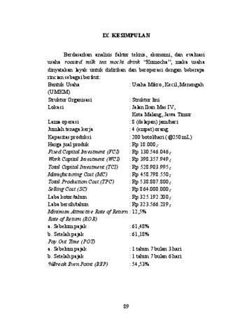 Mochi merupakan camilan tradisional khas Jepang yang memiliki tekstur lembut dan kenyal. Seiring dengan perkembangan jaman, mochi tidak hanya digunakan sebagai camilan tradisional melainkan dikreasikan menjadi produk makanan kekinian yang populer. Salah satu produk inovatif yang dapat dibuat dengan bahan mochi adalah mochi drink. “Kumocha” merupakan minuman mochi drink yang dibuat dengan memadukan roasted milk tea dan mochi rasa cokelat yang dapat disedot. Bahan yang digunakan untuk pembuatan “Kumocha” yaitu tapioka, gula pasir, kakao bubuk, AMDK, teh hitam dan susu UHT. Proses pembuatan roasted milk tea mochi drink melibatkan beberapa tahapan yaitu pembuatan choco mochi, pembuatan roasted milk tea dan pembuatan minuman “Kumocha”. Produk minuman “Kumocha” dikemas dalam botol plastik PET berukuran 250 mL. Bentuk usaha “Kumocha” merupakan usaha mikro kecil menengah dengan kapasitas produksi 200 botol/hari @250 mL. Lokasi usaha terletak di Jalan Ikan Mas IV, Kota Malang, Jawa Timur. Usaha “Kumocha” memiliki 4 tenaga kerja yang terdiri dari pimpinan dan 3 karyawan dengan waktu kerja adalah 8 jam/hari. Produk minuman “Kumocha” dijual dengan harga Rp 18.000/botol dan dipasarkan secara offline dan online. Pemasaran secara offline dilakukan dengan menitipkan produk pada swalayan makanan, kantin sekolah, car free day dan event setempat. Pemasaran online dilakukan melalui media sosial seperti Whatsapp, Instagram dan aplikasi pesan antar makanan. Usaha “Kumocha” memiliki nilai Rate of Return setelah pajak sebesar 61,18%, nilai Pay Out Time (POT) setelah pajak adalah 1 tahun 7 bulan 6 hari dan % Break Even Point (BEP) sebesar 54,53%. Berdasarkan analisa kelayakan usaha tersebut, maka usaha “Kumocha” dinyatakan layak untuk didirikan dan beroperasi.