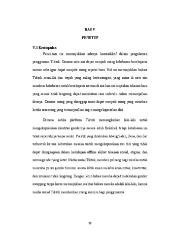 Penelitian ini mengungkap adanya kontradiksi dalam penggunaan TikTok sebagai ruang ekspresi gender. Di satu sisi, TikTok memberikan kebebasan bagi laki-laki untuk mengekspresikan identitas gender mereka melalui anonimitas, kreativitas, dan interaksi tidak langsung. Namun di sisi lain, platform ini juga dapat menjadi ruang represi baru akibat tekanan algoritma, risiko komentar negatif, dan mudahnya konten tersebar. Melalui pendekatan kualitatif, penelitian menemukan bahwa praktik gender swapping pada informan terbentuk dari kebutuhan untuk mengekspresikan sisi diri yang terbatasi di dunia offline. Identitas yang ditampilkan berkembang melalui proses berulang serta validasi sosial, sejalan dengan konsep performativitas gender Judith Butler. Secara keseluruhan, identitas gender di TikTok bersifat cair dan dinegosiasikan terus-menerus melalui pengalaman dan interaksi digital.
