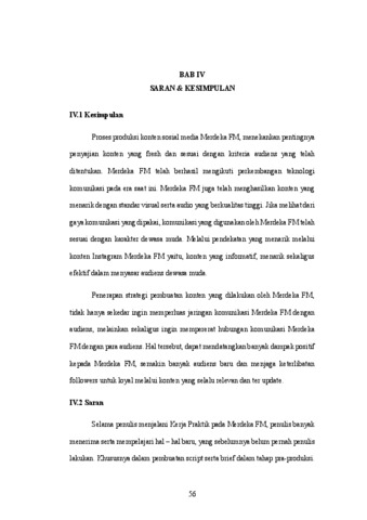Penelitian ini membahas peran produksi konten dalam upaya Radio Merdeka FM (@merdekafm) beradaptasi dengan era digital dan memperluas jangkauan ke platform media sosial, khususnya Instagram dan TikTok. Merdeka FM menargetkan audiens dewasa muda, dengan fokus konten pada isu-isu seputar dunia kerja dan "Budak Korporat". Tujuan utama kerja praktik adalah untuk menerapkan dan mengembangkan keterampilan teknis editing video, serta memahami proses produksi konten audio-visual yang melibatkan tahapan Pra-Produksi, Produksi, dan Pasca-Produksi. Penulis terlibat aktif dalam produksi dan editing berbagai jenis konten, termasuk Podcast Singkat, Konten Repost, Konten Teks, dan Konten Design Carousel. Hasilnya menunjukkan bahwa Merdeka FM berhasil menerapkan strategi produksi konten yang efektif dan konsisten, menghasilkan konten yang fresh, menarik, dan informatif yang sesuai dengan karakter audiens dewasa muda, sekaligus memperkuat keterlibatan followers.