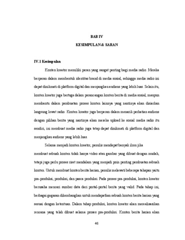 Perkembangan teknologi yang pesat telah mendorong era digital, di mana radio dituntut untuk beradaptasi dengan dunia new media. Radio dalam new media memanfaatkan internet untuk memperluas jangkauan dan memperkuat interaksi dengan pendengarnya. Radio Sonora Surabaya juga memanfaatkan media sosial sebagai alat komunikasi yang efektif, terutama melalui platform Instagram. Laporan ini membahas peran konten kreator dalam pengelolaan media sosial Instagram Sonora Surabaya. Media sosial memberikan ruang bagi radio untuk mengeksplorasi berbagai jenis konten kreatif. Tugas utama konten kreator meliputi perencanaan konten, pengambilan gambar dan video, serta publikasi konten di Instagram. Konten yang diproduksi menitikberatkan pada nilai informasi, dengan tujuan untuk meningkatkan visibilitas serta keterlibatan audiens secara konsisten. Konten yang dihasilkan oleh Konten kreator Sonora Surabaya bertujuan untuk mempromosikan sebuah produk, memenuhi kebutuhan pekerjaan, atau hanya untuk mempertahankan popularitas diri. Konten yang diproduksi melalui tiga tahap yaitu pra-produksi,produksi dan pasca produksi. Secara singkatnya, pra produksi mencari sumber data yang relevan dari portal-portal berita yang valid, proses produksi dimulai dengan menyatukan gambar, elemen dan judul yang akurat sesuai dengan yang terjadi, serta mengambil highlight dari berita yang nantinya akan menjadi caption di konten berita harian Sonora Surabaya, konten kreator juga membuat hastag yang sesuai dengan isi dari konten berita tersebut. Setelah semuanya disetujui oleh pengawas lapangan, barulah konten berita harian tersebut memasuki tahap pasca produksi, pada tahap ini konten kreator Sonora Surabaya hanya bertugas untuk mengupload konten berita harian yang sudah jadi dan disetujui saja, untuk evaluasi terkait konten dan hal lainnya yang bersangkutan dengan instagram Sonora Surabaya sendiri akan di handle oleh pengawas lapangan dan pekerja Sonora Surabaya yang lain.