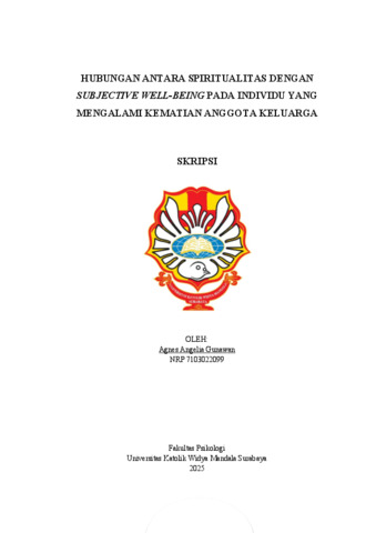 Gunawan, Agnes Angelia (2025) Hubungan antara spiritualitas dengan subjective well-being pada individu yang mengalami kematian anggota keluarga. Undergraduate thesis, Widya Mandala Surabaya Catholic University.