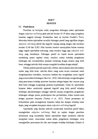 Peristiwa kelahiran dan kematian menjadi bagian integral dalam siklus kehidupan setiap manusia. Peristiwa kematian menjadi salah satu life events terburuk berdampak negatif pada subjective well-being individu. Menurut Diener (1984), kesejahteraan subjektif meliputi bagaimana dan mengapa individu menjalani hidupnya secara positif, termasuk penilaian kognitif dan afektif. Dalam menghadapi masa pasca kehilangan, individu memerlukan bantuan untuk meningkatkan evaluasi positif terhadap tantangan hidupnya. Underwood, (2006) menekankan bahwa spiritualitas ialah keyakinan individu terhadap eksistensi yang melampaui dunia fisik dan pemahaman serta pengalaman individu yang merasa terhubung dengan kekuatan transenden tersebut dalam kehidupan sehari-hari. Peristiwa kehilangan mempengaruhi kondisi psikologis terutama individu pada usia 18-29 tahun yang sedang melewati masa transisi kehidupan. Penelitian ini bertujuan untuk mengetahui hubungan antara spiritualitas dengan subjective well-being pada individu berusia 18–29 tahun yang mengalami kematian anggota keluarga. Metode penelitian menggunakan pendekatan kuantitatif korelasional dengan teknik pengambilan sampel purposive sampling. Partisipan berjumlah 103 orang yang memenuhi kriteria. Instrumen yang digunakan meliputi Daily Spiritual Experience Scale (DSES), Scale of Positive and Negative Experience (SPANE), serta Satisfaction With Life Scale (SWLS). Analisis data menggunakan uji korelasi Kendall’s Tau-b. Hasil penelitian menunjukkan bahwa spiritualitas memiliki hubungan positif signifikan dengan subjective well-being afektif 6,05% dan subjective well-being kognitif 9,18%. Meskipun demikian, kekuatan korelasi berada pada kategori rendah hingga sedang, sehingga menunjukkan bahwa subjective well-being juga dipengaruhi oleh faktor lain seperti dukungan sosial, strategi koping, kualitas hubungan dengan almarhum, serta durasi waktu sejak kehilangan.