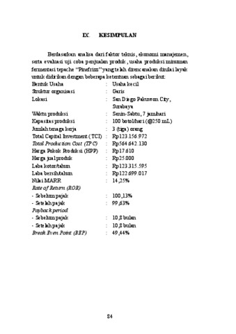 “Pinefrizz” merupakan produk minuman fermentasi berbahan dasar kulit nanas, gula semut, gula pasir, cengkeh, dan kayumanis dengan metode back slopping fermentation. Perencanaan unit usaha pangan “Pinefrizz” didirikan karena adanya peningkatan tren mengonsumsi minuman sehat, seperti minuman fermentasi. Analisa usaha pangan “Pinefrizz” meliputi perancangan teknis dan analisis kelayakan usaha pengolahan pangan sekaligus mengolah food waste menjadi produk bernilai tambah. Proses produksi meliputi perendaman kulit nanas, pencampuran bahan, fermentasi pada suhu 30oC selama 48 jam, pemisahan padatan dan cairan, pasca fermentasi pada 3oC selama 24 jam, serta pengemasan. Unit usaha dirancang dalam skala industri rumah tangga yang berlokasi di San Diego, Pakuwon City, Surabaya, dengan kapasitas produksi 100 botol/hari (@250 mL/botol). Kegiatan produksi dilakukan oleh tiga tenaga kerja selama 8 jam/hari. Investasi yang dibutuhkan (TCI) sebesar Rp123.156.972, total biaya produksi tahunan (TPC) sebesar Rp596.684.405 dan harga jual produk Rp25.000/botol. Hasil analisis ekonomi menunjukkan nilai Rate of Return setelah pajak sebesar 99,63%, Payback Period 10,8 bulan, dan Break Even Point sebesar 49,44%. Berdasarkan aspek teknis dan ekonomi, usahan minuman tepache “Pinefrizz” dinyatakan layak untuk didirikan.