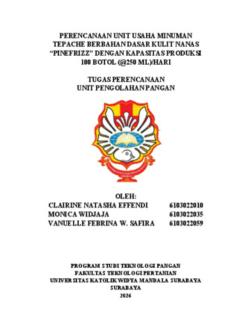 Effendi, Clairine Natasha, Widjaja, Monica and Safira, Vanuelle Febrina Widya (2025) Perencanaan unit usaha minuman tepache berbahan dasar kulit nanas “Pinefrizz” dengan kapasitas produksi 100 botol (@250 ml)/hari. Technical Report (Perencanaan Unit Pengolahan Pangan (FTP), Makalah Komprehensif (FTP)). Faculty of Agricultural Technology, Surabaya. (Submitted)