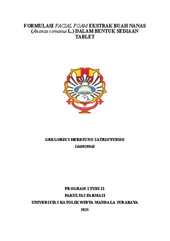 Satrioyudho, Gregorius Herdjuno (2025) Formulasi tablet facial foam ekstrak buah nanas (Ananas comosus L.) dalam bentuk sediaan tablet. Undergraduate thesis, Widya Mandala Surabaya Catholic University.
