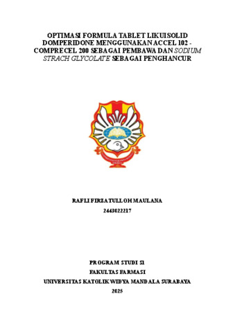 Maulana, Rafli Firzatulloh (2025) Optimasi formula tablet likuisolid domperidone menggunakan accel 102 - comprecel 200 sebagai pembawa dan sodium starch glycolate sebagai penghancur. Undergraduate thesis, Widya Mandala Surabaya Catholic University.