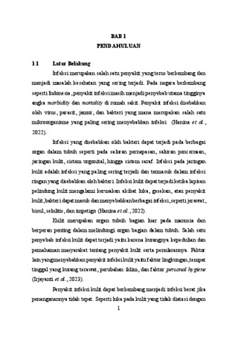 Infeksi kulit yang disebabkan Staphylococcus aureus semakin sulit ditangani karena tingginya resistensi antibiotik serta kemampuan bakteri membentuk biofilm, yang memicu kegagalan terapi konvensional. Kajian pustaka menunjukkan bahwa klindamisin bekerja sebagai penghambat sintesis protein, sedangkan asam galat merupakan senyawa polifenol yang mampu merusak membran sel dan menekan produksi matriks biofilm. Penelitian ini bertujuan mengevaluasi aktivitas antibiofilm kombinasi klindamisin dan asam galat terhadap S. aureus ATCC 6538 dibandingkan penggunaan tunggal. Metode yang digunakan adalah eksperimental laboratorium dengan uji mikrodilusi pada microplate 96-well menggunakan media Mueller Hinton Broth + glukosa 2%. Pembentukan biofilm dianalisis melalui pewarnaan crystal violet 0,1% dan pembacaan nilai Optical Density pada panjang gelombang 599 nm. Data diolah untuk menentukan persentase penghambatan, nilai MBIC₅₀, serta indeks FBICi untuk melihat interaksi kedua senyawa. Hasil penelitian menunjukkan bahwa kombinasi klindamisin dan asam galat memberikan persentase penghambatan biofilm lebih tinggi dibandingkan pemberian tunggal. Nilai MBIC₅₀ kombinasi lebih kecil daripada masing-masing senyawa, menandakan peningkatan efektivitas. Analisis FBICi menunjukkan interaksi aditif yang memperkuat kemampuan keduanya dalam menghambat pembentukan biofilm. Kesimpulan dari penelitian ini adalah kombinasi klindamisin dan asam galat berpotensi menjadi strategi alternatif untuk mengatasi infeksi akibat S. aureus pembentuk biofilm.