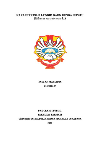 Maulidia, Fauzah (2025) Karakterisasi lendir daun bunga sepatu (Hibiscus rosa-sinensis L.). Undergraduate thesis, Widya Mandala Surabaya Catholic University.