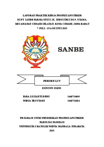 Tri Utami, Widia and Lusianti Dewi, Fara (2026) Laporan Praktik Kerja Profesi Apoteker di PT. Sanbe Farma Unit 1 Jl. Industri I No.9, Utama, Kecamatan Cimahi Selatan, Kota Cimahi, Jawa Barat, 7 Juli – 29 Agustus 2025. Project Report (PKL, PKIPP, Magang D3, Praktik Kerja Profesi Apoteker, Profesi Guru, Profesi Ners dan Profesi Insiyur). Faculty of Pharmacy: Pharmacist Professionals Study Program, Surabaya. (Submitted)