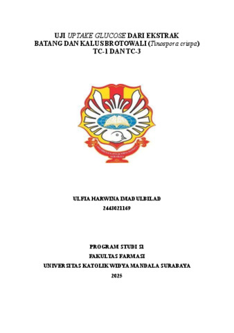 Imadulbilad, Ulfia Harwina (2025) Uji uptake glucose dari ekstrak batang dan kalus brotowali (Tinospora crispa) TC-1 dan TC-3. Undergraduate thesis, Widya Mandala Surabaya Catholic University.