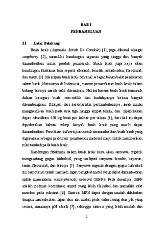 Lerak (Sapindus rarak De Candole) merupakan tanaman tropis dengan buah non-konsumsi, sehingga pemanfaatannya masih sangat jarang. Secara tradisional, lerak dimanfaatkan sebagai bahan pembuatan sabun alami. Namun, pemanfaatannya untuk material fungsional yang berpotensi untuk aplikasi lingkungan masih belum ada. Penelitian ini bertujuan untuk menerapkan konsep zero waste dengan memanfaatkan ekstrak dan residu dari buah lerak dalam sintesis Metal Phenolic Network (MPN) dan material adsorben, berturut-turut. Adsorben berbasis lerak ini digunakan untuk menangani logam berat Cr(VI), salah satu polutan berbahaya bagi lingkungan. Secara garis besar, pembuatan adsorben ini melibatkan dua tahapan utama: (1) ekstraksi fitokimia lerak menggunakan metanol, dan (2) residu lerak hasil ekstraksi kemudian dilapisi dengan menggunakan MPN yang berasal dari penggabungan fitokimia pada ekstrak lerak dengan metal Fe. Adsorben berupa residu lerak terlapisi MPN (selanjutnya disebut sebagai RM) dihasilkan melalui pelapisan MPN dengan variasi rasio Fe:ekstrak (1:1) dan (1:2) w/w. Adsorben ini memiliki kemampuan untuk menghilangkan 96,45% Cr(VI) pada RM11 dan 99,06% Cr(VI) pada RM12 dari air dalam kondisi pH 2, suhu 30°C, waktu kontak 24 jam, dan kecepatan pengadukan 145 rpm. Evaluasi kinetika adsorpsi menunjukkan kecocokan sistem dengan persamaan pseudo second order yang mengindikasikan penyerapan secara chemisorption. Sementara, studi adsorpsi isoterm menunjukkan sifat adsorpsi Cr(VI) oleh RM yang sesuai dengan persamaan langmuir, yang mengindikasikan penyerapan secara monolayer. Efisiensi adsorpsi Cr(VI) oleh RM meningkat dengan peningkatan suhu, yang menandakan sifat endotermik. Mekanisme adsorpsi didominasi oleh ion exchange dan electrostatic interaction. Hasil penelitian ini menunjukkan bahwa adsorben berbasis buah lerak ini memiliki potensi besar untuk pengolahan air dari cemaran logam berat Cr(VI), sekaligus mendukung prinsip daur ulang limbah melalui pendekatan zero waste.