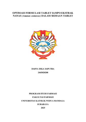 Saputra, Daffa Dika (2025) Optimasi formulasi tablet sampo ekstrak nanas (Ananas Comosus) dalam sediaan tablet. Undergraduate thesis, Widya Mandala Surabaya Catholic University.
