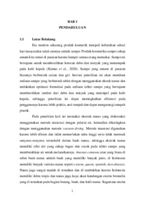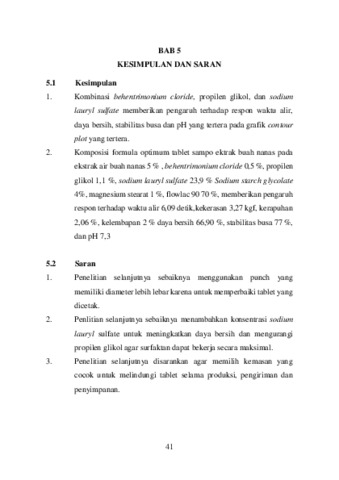 Tablet Sampo yang terbuat dari ektrak air buah nanas (Ananas comosus L.) dan komponen bahan penyusun tablet konvensional. Sampo dalam bentuk padat memiliki keuntungan yaitu lebih praktis, dan mudah dibawa. Ekstrak air buah nanas diperoleh melalui metode maserasi dengan pelarut air kemudian dikeringkan menggunakan metode vacuum drying. Penelitian ini bertujuan untuk mengoptimalkan formulasi tablet sampo ekstrak nanas dengan pendekatan metode simplex lattice design (SLD) serta mengevaluasi pengaruh variasi konsentrasi behentrimonium chloride, propilen glikol, dan sodium lauryl sulfate terhadap mutu fisik massa tablet dan tablet yang dihasilkan. Tablet sampo dibuat dengan metode granulasi basah menggunakan enam formula berbeda. Evaluasi mutu fisik meliputi uji kelembapan, waktu alir, kekerasan, kerapuhan, pH, busa, daya bersih, dan kelembutan. Optimasi formula dilakukan dengan bantuan metode Simplex Lattice Design (SLD) perangkat lunak design expert untuk menentukan kombinasi bahan tambahan yang paling efektif. Semua formula memenuhi persyaratan Komposisi formula optimum tablet sampo ektrak buah nanas pada ekstrak nanas 5 %, behentrimonium cloride 0,5 %, propilen glikol 1,1 %, sodium lauryl sulfate 23,9 % Sodium starch glycolate 4%, magnesium stearat 1 %, flowlac 90 70 %. memberikan pengaruh respon terhadap waktu alir 6,09 detik,kekerasan 3,27 kgf, kerapuhan 2,06 %, kelembapan 2 % daya bersih 66,90 %, stabilitas busa 77 % , dan pH 7,3 Formula optimum ini menunjukkan karakterisitik fisik dan daya pembersih yang baik, meskipun nilai pH sedikit lebih tinggi dari rentang ideal pH kulit kepala. Tablet sampo ekstrak air buah nanas memiliki potensi sebagai alternatif inovatif pembersih wajah dalam bentuk sediaan padat.