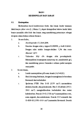 Lendir tanaman lidah buaya (Aloe vera (L.) Burm. f.) diketahui mengandung polisakarida utama berupa asemannan. Penelitian ini bertujuan untuk mengkarakterisasi sifat fisika dan kimia lendir lidah buaya guna mengevaluasi potensinya sebagai eksipien farmasi. Penelitian dilakukan secara eksperimental dengan mengekstraksi lendir dari daun segar lidah buaya menggunakan metode pengendapan aseton. Karakterisasi fisika meliputi pengujian pH, indeks pembengkakan, densitas, dan viskositas, sedangkan karakterisasi kimia meliputi skrining fitokimia, analisis spektroskopi FTIR, dan ¹H-NMR. Hasil penelitian menunjukkan bahwa larutan lendir lidah buaya 1% memiliki pH sebesar 4,45±0,01 yang bersifat asam lemah dan sesuai untuk sediaan farmasi. Nilai indeks pembengkakan sebesar 52,56±4,06% menunjukkan kemampuan menyerap air yang tinggi. Densitas curah dan densitas mampat masing-masing sebesar 0,364 g/mL dan 0,390 g/mL dengan indeks kompresibilitas 7,2% dan rasio Hausner 1,072, yang mengindikasikan sifat alir serbuk yang baik. Pengujian viskositas menggunakan Viskometer Brookfield pada 60 rpm menghasilkan nilai 30,6 cPs yang menunjukkan sifat pseudoplastik khas polimer alami. Skrining fitokimia menunjukkan hasil positif terhadap karbohidrat dan flavonoid, sedangkan alkaloid, saponin, tanin, serta steroid–triterpenoid tidak terdeteksi. Analisis FTIR menunjukkan pita serapan khas gugus O–H, C–H, C=O, dan C–O/C–O–C yang mengkonfirmasi keberadaan polisakarida. Spektrum ¹H-NMR memperlihatkan sinyal proton pada daerah 1,8–2,8 ppm dan 3,1–3,3 ppm yang konsisten dengan struktur polisakarida asemannan. Berdasarkan hasil tersebut, dapat disimpulkan bahwa lendir lidah buaya memiliki karakteristik fisika dan kimia yang mendukung penggunaannya sebagai eksipien alami, terutama sebagai pengikat dan pembentuk gel dalam sediaan farmasi.