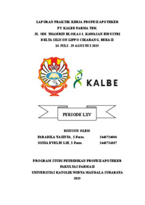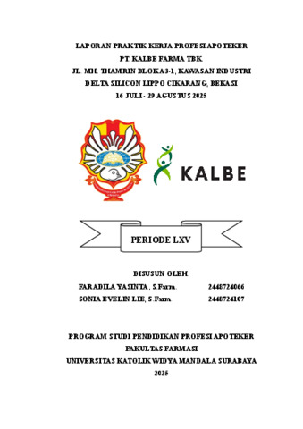 Yasinta, Faradila and Lie, Sonia Evelin (2025) Laporan praktik kerja profesi apoteker PT. Kalbe Farma Tbk. Jl. MH. Thamrin Blok A3-1, Kawasan Industri Delta Silicon Lippo Cikarang, Bekasi 16 Juli–29 Agustus 2025. Project Report (PKL, PKIPP, Magang D3, Praktik Kerja Profesi Apoteker, Profesi Guru, Profesi Ners dan Profesi Insiyur). Faculty of Pharmacy, Surabaya. (Submitted)