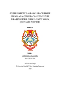 Syaifuddin, Afifah Firdaus (2025) Studi deskriptif gambaran sikap individu dewasa awal terhadap Cancel Culture pada penggemar entertainment Korea Selatan di Indonesia. Undergraduate thesis, Widya Mandala Surabaya Catholic University.