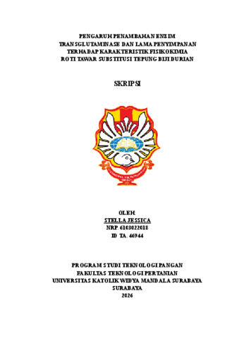 Jessica, Stella (2026) Pengaruh penambahan enzim transglutaminase dan lama penyimpanan terhadap karakteristik fisikokimia roti tawar substitusi tepung biji durian. Undergraduate thesis, Widya Mandala Surabaya Catholic University.