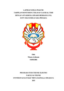Laporan kerja praktik ini membahas kegiatan perancangan dan implementasi prototipe perangkat lunak yang dilakukan selama pelaksanaan kerja praktik pada tanggal 1 Agustus 2025 hingga 31 Desember 2025 di PT. Solusi Rekatama Persada. Perusahaan ini berfokus pada solusi teknologi di bidang Embedded Systems dan Internet of Things (IoT). Kegiatan kerja praktik bertujuan untuk mengaplikasikan pengetahuan teoritis ke dalam proyek dunia nyata serta meningkatkan kompetensi sebagai calon lulusan dari Program Studi Teknik Elektro Universitas Katolik Widya Mandala Surabaya. Penugasan khusus dalam kerja praktik ini adalah pembuatan prototipe "Tampilan Monitoring Tekanan Gas Real-Time dengan Antarmuka Dinamis". Tujuan utamanya adalah untuk menyediakan Human-Machine Interface (HMI) yang modern dan fleksibel, guna mengatasi keterbatasan sistem monitoring konvensional yang bersifat statis. Sistem ini dibangun pada platform perangkat keras CrowPanel ESP32 5-inch dan diprogram menggunakan framework Arduino. Metode pengembangan mencakup perancangan visual dengan SquareLine Studio, implementasi logika menggunakan C++, dan konfigurasi driver tingkat rendah menggunakan library LovyanGFX. Dengan memanfaatkan Light and Versatile Graphics Library (LVGL) versi 8.3.11, berhasil dikembangkan sebuah antarmuka multi-layar yang sepenuhnya dinamis. Hasil utama dari proyek ini adalah implementasi fitur kustomisasi parameter (nama gas, satuan, threshold) yang datanya disimpan secara permanen menggunakan library Preferences, serta fitur rentang-otomatis (auto-ranging) pada grafik yang menyesuaikan skala visualisasi secara cerdas. Komunikasi data dengan unit sensor disimulasikan menggunakan format JSON melalui antarmuka serial. Pengujian sistem memvalidasi bahwa prototipe HMI yang dihasilkan telah berfungsi dengan andal, responsif, dan mampu menyajikan data secara intuitif, sehingga memenuhi semua tujuan perancangan.