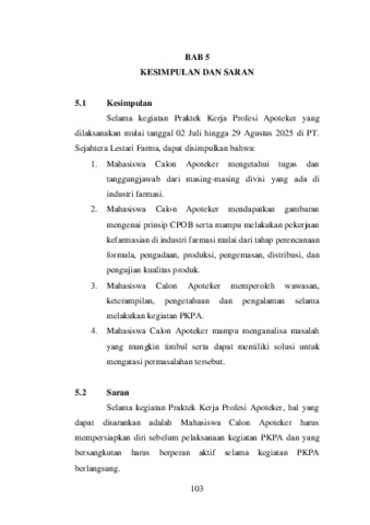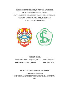 Larasati, Yohana and Wijaya, Giovanni Indra (2025) Laporan Praktek Kerja Profesi Apoteker PT. Sejahtera Lestari Farma Jl. Wicaksono No.1, Dusun Talun, Silo Kambang, Gunung Gangsir, Kec. Beji, Pasuruan 01 Juli – 29 Agustus 2025. Project Report (PKL, PKIPP, Magang D3, Praktik Kerja Profesi Apoteker, Profesi Guru, Profesi Ners dan Profesi Insiyur). Faculty of Pharmacy, Surabaya, Indonesia. (Submitted)